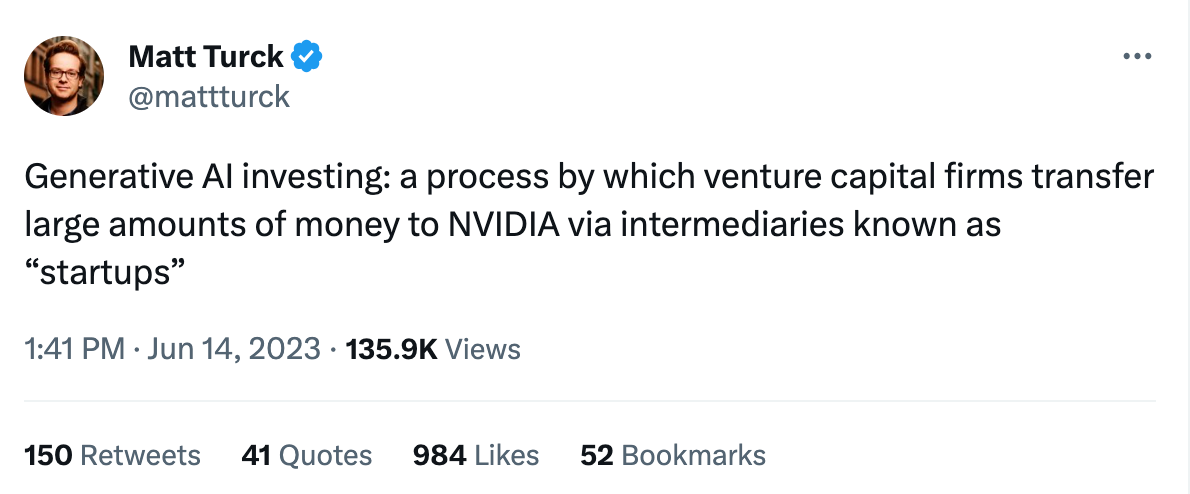 💬 Some tweets – Generative AI investing: a process – “Startups are bought not sold” is a misbelief – How the AI investment boom was catalyzed